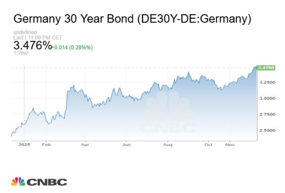 Δεν είναι τυχαίο ότι η απόδοση του 30ετούς γερμανικού ομολόγου ξεπέρασε το 3,4%, καταγράφοντας το υψηλότερο επίπεδο της τελευταίας 10ετίας και πλέον. Η επιστροφή σε θετικές πραγματικές αποδόσεις δεν είναι τυχαία. Αντικατοπτρίζει το νέο τοπίο στη Γερμανία με την χαλάρωση του συνταγματικού φρένου χρέους, τις αυξημένες κεφαλαιακές ανάγκες για επενδύσεις εκεί και στην υπόλοιπη ΕΕ και το τέλος της εποχής των μηδενικών επιτοκίων από την ΕΚΤ.