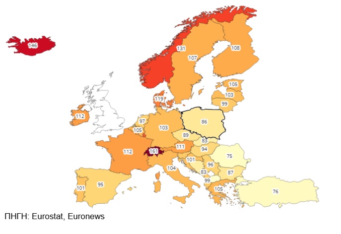 Πιο συγκεκριμένα ένα καλάθι τροφίμων αξίας 100 ευρώ στην ΕΕ και 103,2 ευρώ στην ευρωζώνη κατά μέσο όρο το 2024, θα κόστιζε 105,1 ευρώ στην Ελλάδα, δηλαδή 5,1% ακριβότερα, 104,8 ευρώ στη Κύπρο και 104 στην Ιταλία. Από την άλλη πλευρά, το ίδιο καλάθι θα κόστιζε 161,1 στην Ελβετία, 111,9 ευρώ στην Ιρλανδία και 111,5 ευρώ στη Γαλλία.