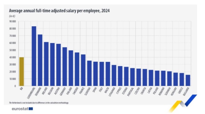 Υπενθυμίζεται ότι η Ελλάδα εμφανίζεται να καταλαμβάνει την προτελευταία θέση στην ΕΕ μετά την Βουλγαρία με βάση το μέσο ετήσιο εισόδημα ενός εργαζομένου πλήρους απασχόλησης (18.000 ευρώ περίπου) το 2024 σύμφωνα με την Eurostat. Όμως, το πραγματικό νούμερο είναι κοντά στις 20.500 ευρώ με βάση τα επίσημα στοιχεία της Εργάνης όπως έχουμε επισημάνει στο παρελθόν. Ακόμη κι έτσι, η Ελλάδα ανεβαίνει μεν μερικά σκαλιά αλλά παραμένει χαμηλά στη γενική κατάταξη.