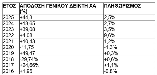 Στον κατωτέρω πίνακα παραθέτουμε τόσο την ετήσια απόδοση του Γενικού Δείκτη του ΧΑ όσο και τον μέσο ετήσιο πληθωρισμό στην Ελλάδα την περίοδο 2016-2025. Με εξαίρεση το 2016 και το 2020, άντε και το 2019, τα πραγματικά επιτόκια ήταν αρνητικά. Κοινώς, οι καταθέσεις έχασαν μέρος της αξίας τους. Αντίθετα, βγήκαν κερδισμένοι, όσοι επένδυσαν σε μετοχές ή άλλα περιουσιακά στοιχεία.