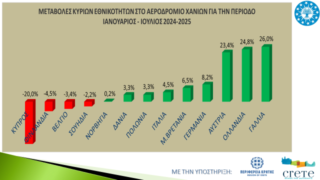 Σχετικά με τις υπόλοιπες εθνότητες, ενθαρρυντικές είναι οι αυξήσεις των Αυστριακών και Ολλανδών με διψήφιο ποσοστό αύξησης ενώ αντίθετα ανησυχητική είναι η πτώση των Κυπρίων κατά 20%. Επίσης, έχουμε και την προσέλκυση νέων αγορών, αφού για πρώτη φορά επισκέπτονται τη Δυτική Κρήτη με απευθείας πτήση αλλοδαποί επισκέπτες που προέρχονται από την Πορτογαλία.