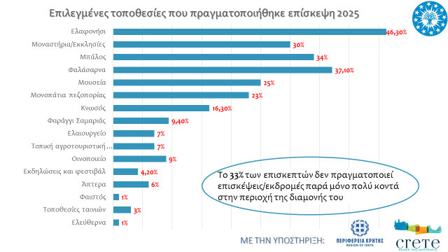 Σχεδόν οι μισοί επισκέπτες επιλέγουν την παραλία του Ελαφονησίου και ακολουθούν αυτές των Φαλασάρνων και Μπάλου, ενώ εξίσου σημαντικός αριθμός τουριστών πραγματοποιεί επισκέψεις σε μοναστήρια, εκκλησίες, μουσεία και αρχαιολογικούς χώρους. Παρατηρείται ότι οι εμβληματικές παραλίες του Νομού Χανίων, είναι στις πρώτες επιλογές των αλλοδαπών τουριστών και κρίνεται απαραίτητη η αειφορική διαχείριση των προορισμών αυτών, δεδομένου του πολύ μεγάλου αριθμού αφίξεων αλλοδαπών τουριστών.