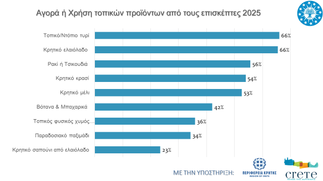 Αναφορικά με τα τοπικά προϊόντα διατροφής, ο αλλοδαπός τουρίστας μένει πολύ ικανοποιημένος από τα ποιοτικά χαρακτηριστικά των προϊόντων αυτών, ενώ φέτος δείχνει να προβαίνει σε μεγαλύτερες από άλλες χρονιές ποσότητες αλλά και ποικιλία προϊόντων. Για πρώτη φορά τα τοπικά τυριά μαζί με το ελαιόλαδο βρίσκονται στις πρώτες θέσεις των προτιμήσεων των αλλοδαπών τουριστών, με δύο στους τρεις αλλοδαπούς επισκέπτες να προβαίνουν σε αγορά αυτών των προϊόντων.