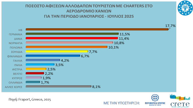 Σχετικά με τις αφίξεις αλλοδαπών τουριστών στο αεροδρόμιο Χανίων και με βάση τα πρόσφατα στοιχεία της Fraport-Greece για την περίοδο Ιανουάριος-Ιούλιος 2025, καταγράφεται ρεκόρ αφίξεων με 875 χιλιάδες αφίξεις, σημειώνοντας αύξηση 3% σε σχέση με την αντίστοιχη περίοδο του 2024, όπου είχαν σημειωθεί 850 χιλ. αφίξεις, χρονιά κατά την οποία είχαν καταγραφεί και οι περισσότερες αφίξεις έως τότε.