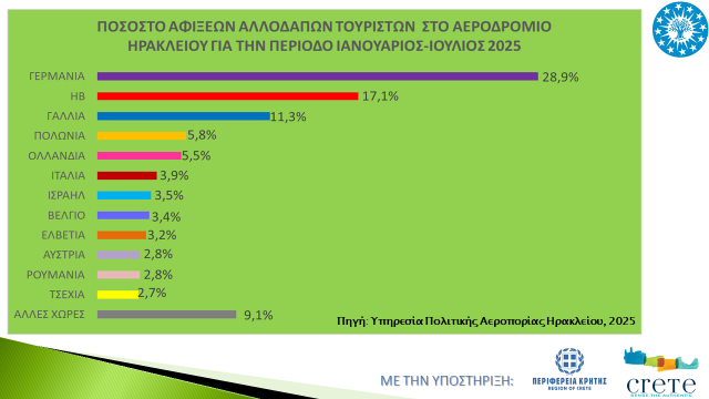 Αναφορικά με τις αφίξεις αλλοδαπών τουριστών στο αεροδρόμιο Ηρακλείου και με βάση τα πρόσφατα στοιχεία της Υπηρεσίας Πολιτικής Αεροπορίας Ηρακλείου, για την περίοδο Ιανουάριος-Ιούλιος 2025, καταγράφεται επίσης ρεκόρ αφίξεων, της τάξεως των 2,1 εκατ. αφίξεων, σημειώνοντας αύξηση κατά 6% σε σχέση με τις αφίξεις της αντίστοιχης περυσινής περιόδου που είχαν φτάσει τα 2 εκ. αφίξεις, οι οποίες ήταν και οι υψηλότερες αφίξεις έως τότε.