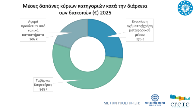 Σε σχέση με το μέγεθος της μέσης δαπάνης που πραγματοποιεί ο επισκέπτης στις κύριες κατηγορίες εξόδων έως τώρα δεν διαφέρουν καθόλου ή στατιστικά σημαντικά από το προηγούμενο έτος. Οι μέσες δαπάνες για εστίαση (~545 €) καταλαμβάνουν πάνω από το 50% των συνολικών δαπανών, ενώ ακολουθούν δαπάνες ενοικίασης οχήματος (~276 €) και αγορές προϊόντων (~206 €).