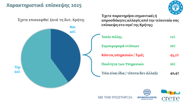 Τέλος, θα θέλαμε να επισημάνουμε τη δυσφορία των αλλοδαπών τουριστών αναφορικά με το αυξημένο κόστος παροχής υπηρεσιών στους χώρους εστίασης, φιλοξενίας και μεταφοράς, όπως επίσης και την έντονη ανησυχία και προβληματισμό τους για τον συνωστισμό σε περιοχές ιδιαίτερου φυσικού κάλλους της Δυτικής Κρήτης, τα οποία χρήζουν άμεσης αντιμετώπισης από τους υπεύθυνους φορείς.