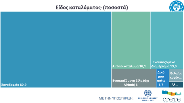 Ελαφρώς αυξημένο είναι το ποσοστό των αλλοδαπών τουριστών που προτιμούν τις βραχυπρόθεσμες ενοικιάσεις τύπου AirBnB, αφού περίπου το 16% των επισκεπτών επιλέγει να διαμένει σε τέτοια καταλύματα.