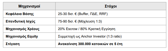 Μέσω της μόχλευσης (leverage), κάθε ένα ευρώ δημόσιας δέσμευσης κινητοποιεί τουλάχιστον τρία ευρώ ιδιωτικών κεφαλαίων, ξεκλειδώνοντας συνολική ισχύ 75 έως 90 δισεκατομμυρίων ευρώ για την πραγματική οικονομία.