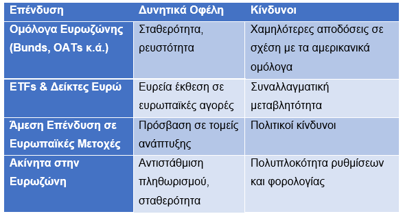 Με την προοπτική ενίσχυσης του ευρώ, οι επενδυτές επανεξετάζουν την έκθεσή τους σε ευρωπαϊκά περιουσιακά στοιχεία. Οι επιλογές περιλαμβάνουν: