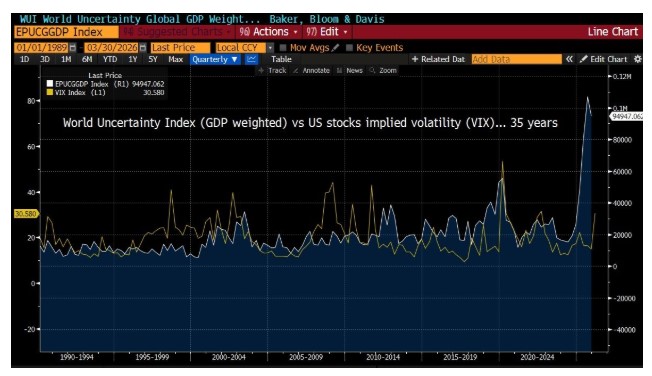 Όμως, ένας άλλος δείκτης εκπέμπει πολύ πιο ανησυχητικό σήμα. Αναφερόμαστε στον Παγκόσμιο Δείκτη Αβεβαιότητας (World Uncertainty Index) του Alexis Hongre. Όπως φαίνεται στο γράφημα, ο συγκεκριμένος δείκτης βρίσκεται στο υψηλότερο επίπεδο από το 1989 με βάση τα δεδομένα μέχρι την 30η Μαρτίου.