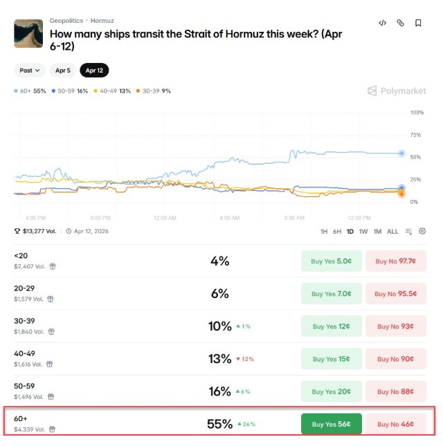 Οι πιθανότητες που έδινε χθες η αγορά στοιχημάτων Polymarket για αύξηση του αριθμού των πλοίων που διέρχονται από το Στενό του Ορμούζ σε πάνω από 60 καθημερινά διπλασιάστηκαν, ανεβαίνοντας στο 55%. Αυτό είναι ενδεικτικό της αισιοδοξίας τους ότι ο αποκλεισμός του Στενού από το Ιράν αρχίζει να χαλαρώνει.
