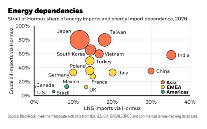 Όμως, χαμένες είναι επίσης οι χώρες που εισάγουν πετρέλαιο και LNG από το Στενό του Ορμούζ. Η BlackRock αποτύπωσε τον βαθμό εξάρτησης των χωρών με κριτήριο το ποσοστό των εισαγωγών αργού και υγροποιημένου φυσικού αερίου στο παρακάτω διάγραμμα.