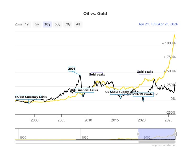 Με τον αργό στα 93 δολάρια το βαρέλι και την τιμή του χρυσού στα 4.740 δολάρια η ουγκιά χθες το βράδυ, μια ουγκιά θα αγόραζε 51 περίπου βαρέλια. Τα τελευταία 50 χρόνια, η αναλογία είναι 21 βαρέλια ανα ουγκιά.