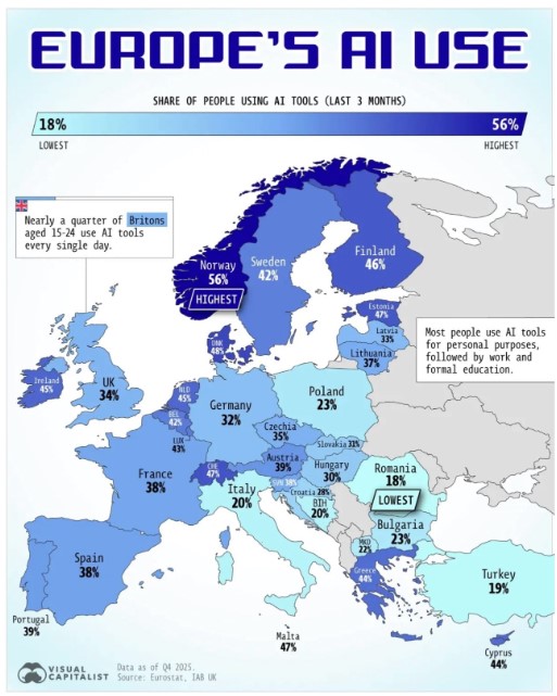 Σύμφωνα λοιπόν με το σχετικό διάγραμμα που παραθέτει ο Visual Capitalist και το οποίο βασίζεται σε έρευνα της Ευρωπαϊκής Επιτροπής σε άτομα ηλικίας 16-74 ετών για το 2025, το 34% των κατοίκων της ευρωζώνης και το 32% της ΕΕ χρησιμοποιούσε την ΑΙ.