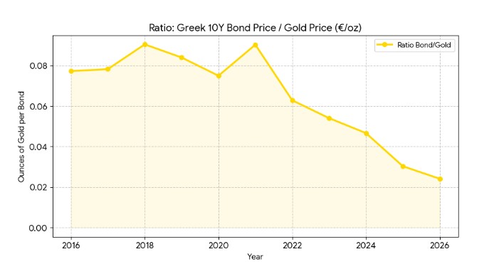 Φυσικά, δεν συμβαίνει το ίδιο με τα ελληνικά ομόλογα. Οι απώλειές τους από το 2021 και μετά συνδέονται κυρίως με τη μεγάλη άνοδο της τιμής του χρυσού.